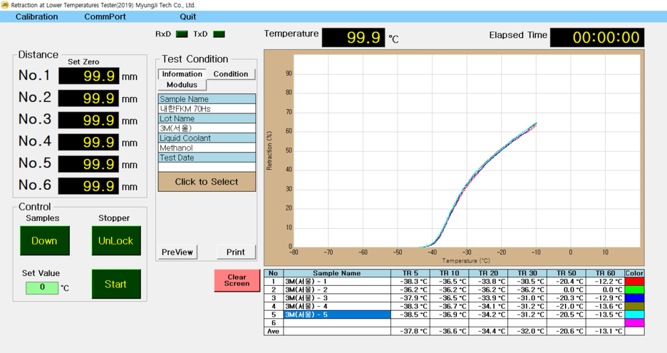 1. 5개 또는 6개의 테스트 스테이션을 포함한 본 시험기는 전산화 되어 있습니다. 2. 냉각매체가 냉각되고 샘플이 고정된 후에 자동으로 시험을 수행합니다. 3. 프로그램으로 온도 상승을 제어하고 샘플의 길이 변화를 실시간으로 확인 및 기록하여 측정할 수 있습니다. 4. 결과값은 그래프로도 표기되며 TR10 ,30, 50, 70값이 자동으로 계산됩니다. |