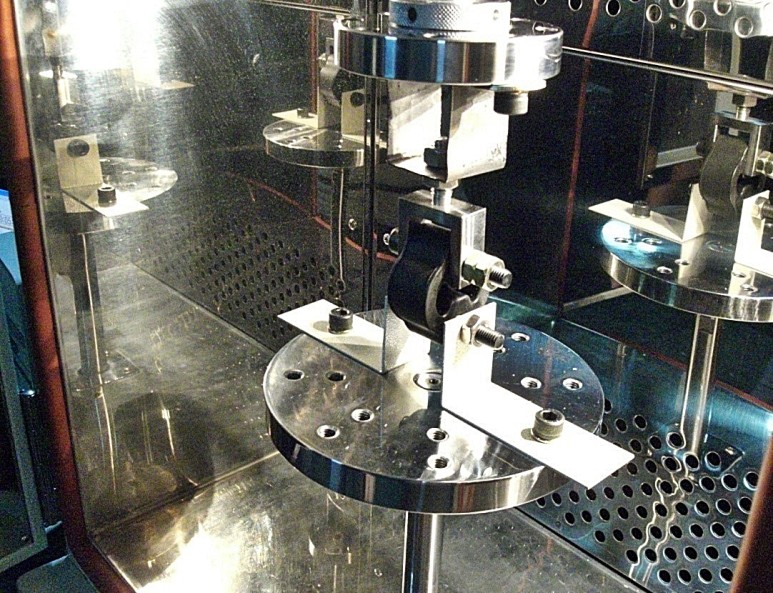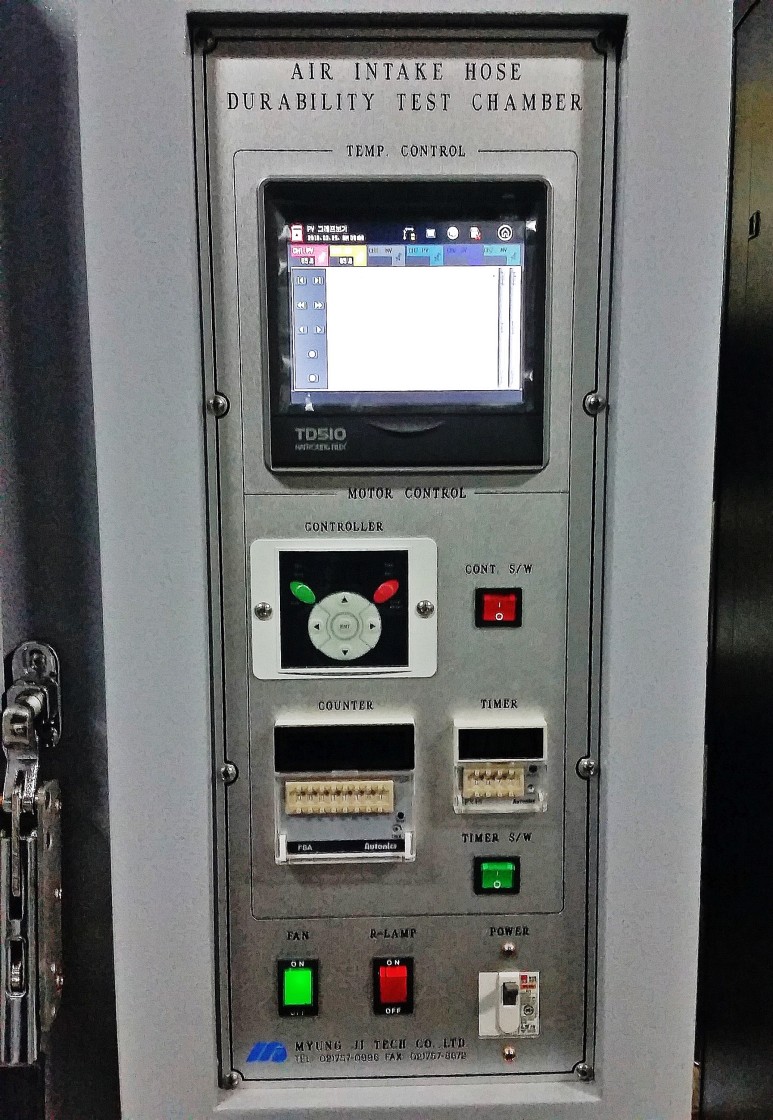 고무 제품의 거리, 하중, 온도를 설정하여 일정 속도로 일정 횟수 구동하여 제품에 대한 내구력을 측정하는 장비입니다.