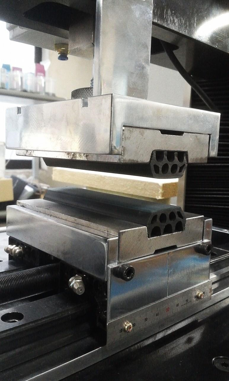 본 장치는 압축 시험 방식으로 진행하게 되며 압축 시 샘플과 샘플을 편향을 주며 편향 거리는 0부터 시작해서 5, 10mm등 임의적으로간격을 주는 시험으로 만능재료시험기(UTM)에 장착하여 사용이 가능합니다.