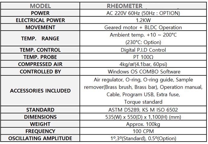 시험에 대한 방법은 레오메타와 동일 하고 다른 고무의 성질을 평가함에 있어 연속적이고 안정된 커브를 보여주며, 특히 탄성 및 경화에 대한 토크/시간곡선이 테스트와 동시에 평가 분석이 가능할 정도로 이상적으로 적절하게 나타나는 특징을 가지고 있다.